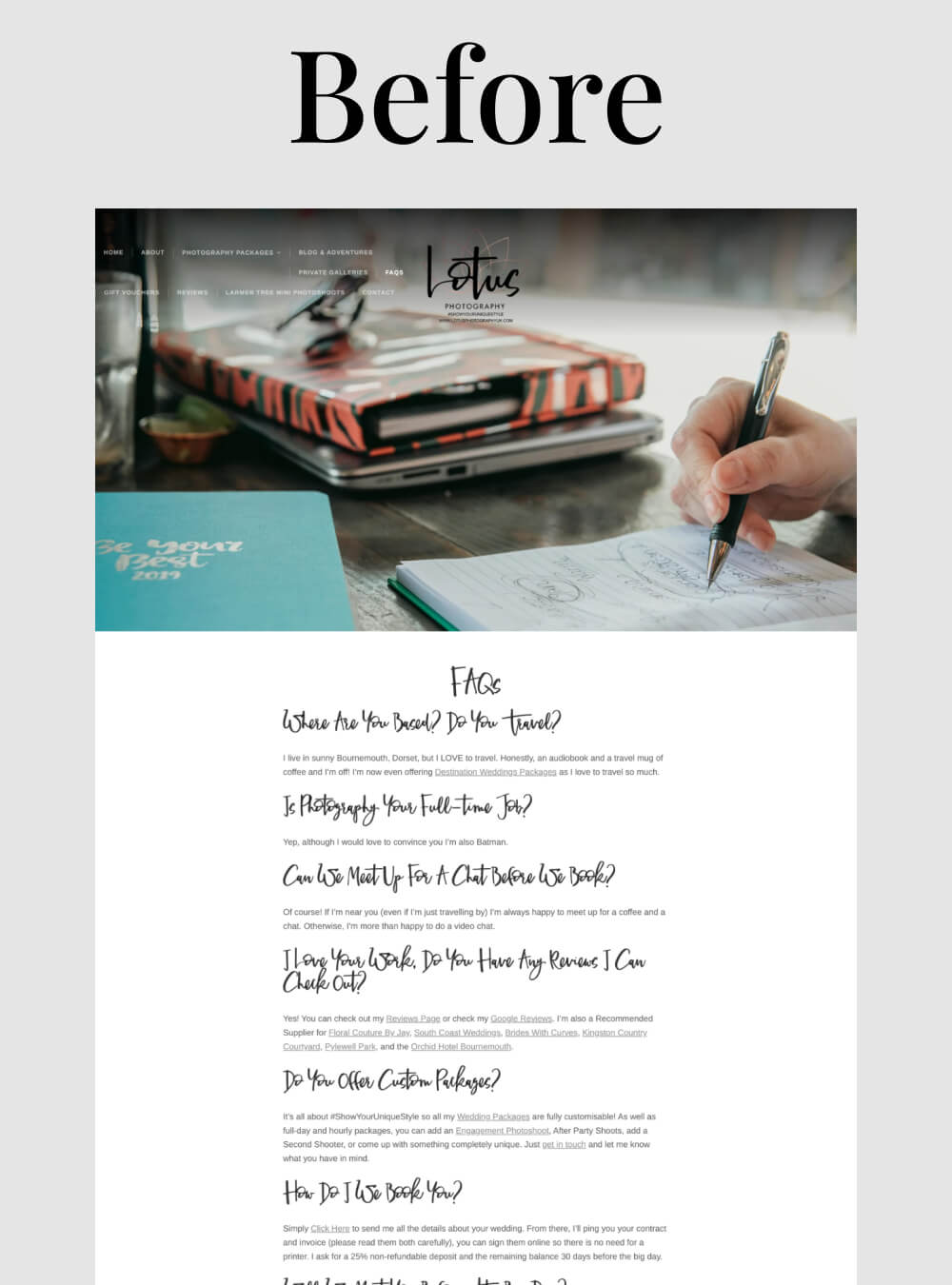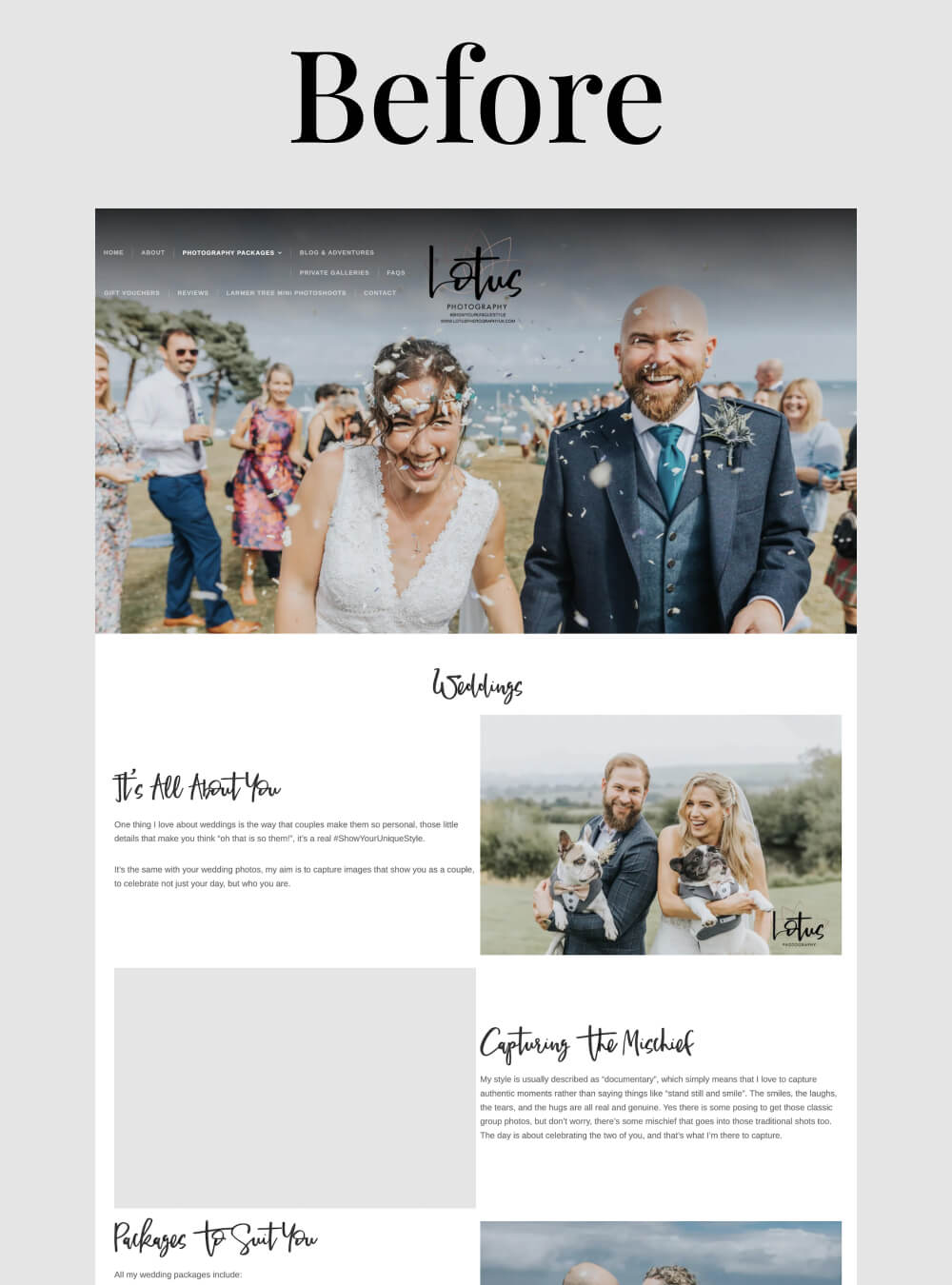 The old site was stuck on WordPress.com, which severely limited what she could do. Plus, it wasn’t speaking to her ideal couples – those fun-loving, authentic people who want their wedding photos to tell their real story, not some cookie-cutter version.